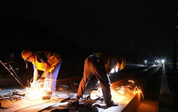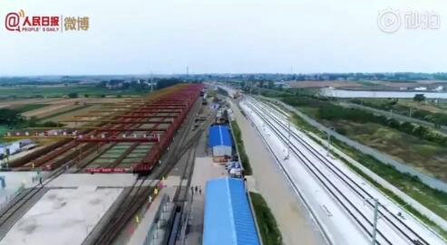 該段火遍全網(wǎng)的視頻拍攝自湖北最美高鐵——漢十高鐵的施工現(xiàn)場,展示了我國最新的軌道鋪設技術——500米長軌鋪設和焊接打磨技術。