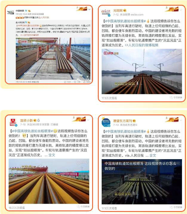 7月10日,中鐵十一局集團攝制的《中國高鐵軌道如絲般順滑,這段視頻告訴你怎么做到的》視頻發(fā)布后,相繼在新浪微博中被人民日報、紫光閣、光明網(wǎng)、新華社瞭望東方周刊、國資小新、中國鐵路、人民鐵道等眾多網(wǎng)絡大V轉發(fā),在團中央B站更是引來網(wǎng)友彈幕刷屏點贊。不到一周時間,該視頻閱讀量已突破1000萬,目前仍呈上升趨勢。