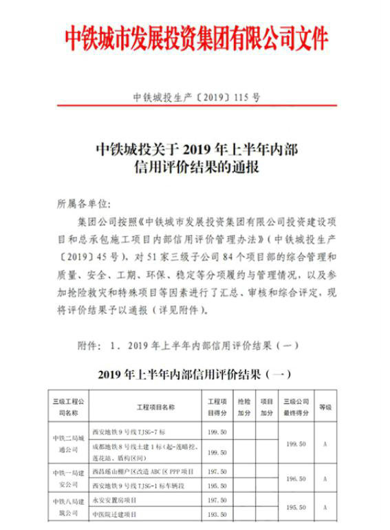 8月7日,中鐵城市發(fā)展投資集團有限公司公布了2019年上半年內部信譽評價結果,在中國中鐵參評的51家三級公司中,中鐵一局建安公司以總分第二名的成績進入8家A級企業(yè)行列。這也是中鐵一局建安公司自奪得中鐵城投2018年下半年信譽評價榜眼以來,在中鐵城投內部信用評價中再次名列前茅。