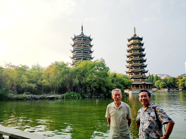 桂林石刻、七星巖拓林、世界上最大的駱駝、元風(fēng)洞、普陀山、逍遙樓,莫老兵陪著我一路游覽;駐足于烈士紀(jì)念碑和陳光烈士紀(jì)念塔之下,忽然發(fā)現(xiàn)最危險(xiǎn)的往往就是身邊最近的人,因?yàn)橹挥猩磉呑罱娜顺鲑u(mài)的信息才是最真實(shí)可靠而讓這些仁人志士被捕入獄,甚至獻(xiàn)出生命而就義;一路踏來(lái),日月雙塔、榕湖、杉湖景色慢慢讓人流連于夜色降臨……