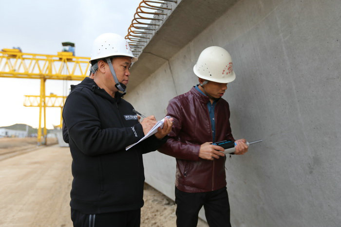 試驗(yàn)人員檢測(cè)預(yù)制箱梁回彈強(qiáng)度???????