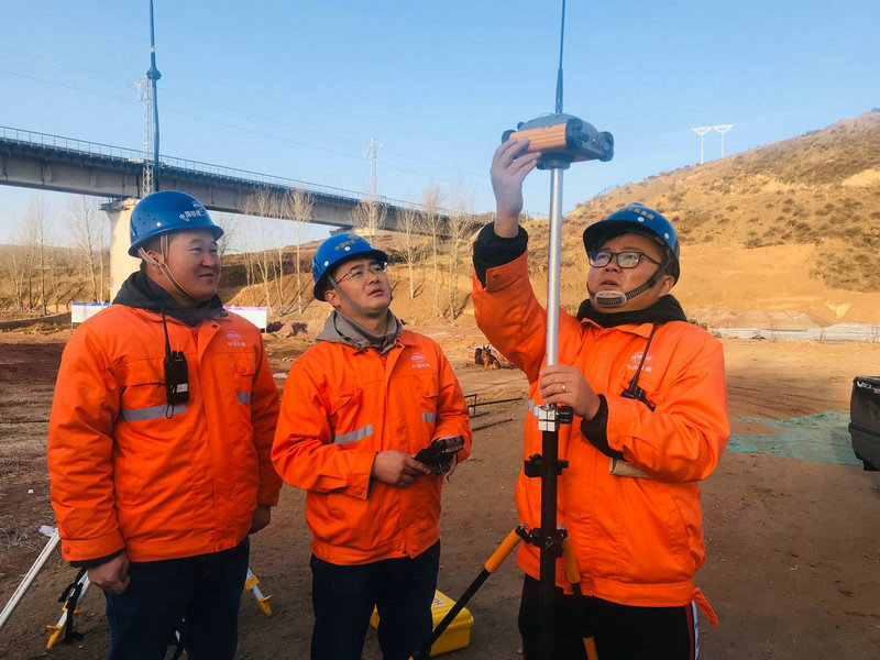 圖為職工們正在認(rèn)真調(diào)整GPS測(cè)量?jī)x的情景