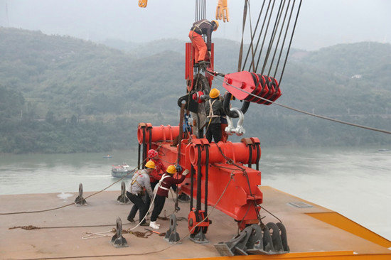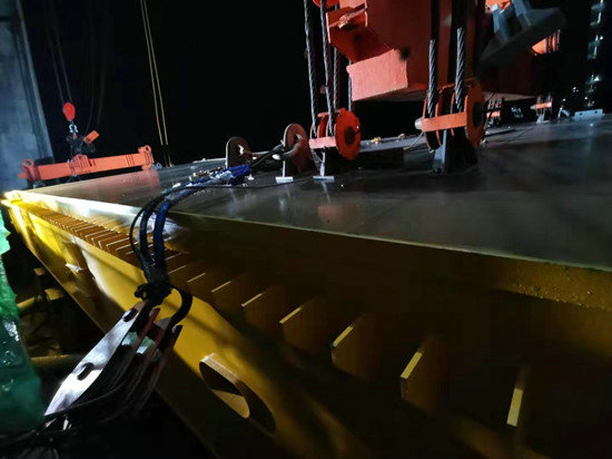 “太洪長江大橋北岸E類端梁段梁長10.8m,寬39.6米,重193.4t,該梁段設(shè)計(jì)無永久吊索。該梁段吊裝采用蕩移施工工藝,首先由北岸側(cè)跨纜吊機(jī)垂直起吊E類梁段,提升至設(shè)計(jì)橋面高度以上40cm左右的位置后,利用布置于引橋的牽引系統(tǒng)緩慢地將梁段牽引至其安裝位置,最后緩慢下放跨纜吊機(jī)起重索,直至完全卸載,完成端梁段的吊裝作業(yè)。”大橋施工總指揮李忠賢介紹到。