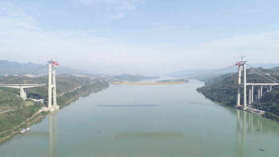 太洪長江大橋位于重慶市巴南區(qū)和渝北區(qū)的交界處,它是南兩高速的主要控制性工程,也是全線唯一的一座跨長江大橋,大橋全長1436米,為主跨808米、設(shè)計(jì)時(shí)速80公里的雙向6車道鋼箱梁懸索橋。根據(jù)工期計(jì)劃安排,鋼箱梁吊裝工作將于2019年年底吊裝完成,從而實(shí)現(xiàn)大橋的全部合龍。