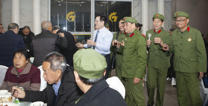 會(huì)務(wù)組領(lǐng)導(dǎo)向戰(zhàn)友們敬酒 12點(diǎn)20分,演出結(jié)束后,工作人員安排全體戰(zhàn)友及家屬在酒店用餐。會(huì)長(zhǎng)楊澤林、執(zhí)行會(huì)長(zhǎng)賀正海、副會(huì)長(zhǎng)楊德榮、副會(huì)長(zhǎng)汪正茂、秘書長(zhǎng)張永華等向全體戰(zhàn)友致祝酒詞并敬酒,祝賀參軍50周年慶典聯(lián)誼會(huì)取得圓滿成功!并希望戰(zhàn)友們保重身體,老有所樂(lè),愉快地生活,安享晚年!在熱烈的掌聲中,老戰(zhàn)友們舉杯歡慶,希望明天更美好!