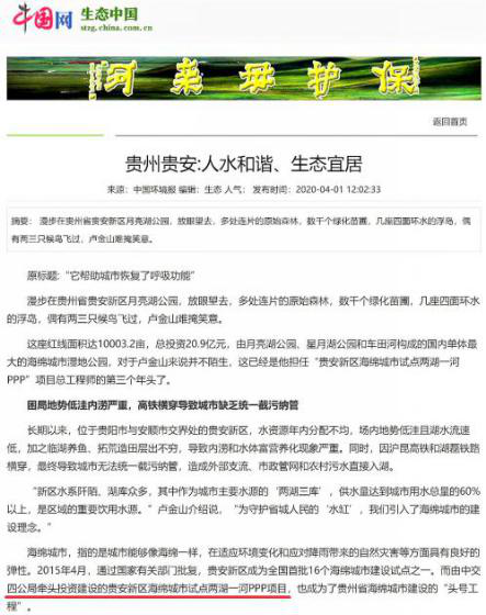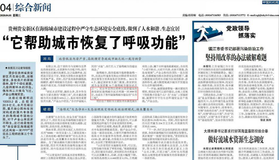 在1500多字的篇幅中,記者真實地還原了中交四公局聯(lián)合體建設(shè)者智慧治水的艱辛歷程:開工前項目面臨“地勢低洼內(nèi)澇嚴(yán)重及高鐵橫穿導(dǎo)致城市缺乏統(tǒng)一截污納管”的困局,通過借助低影響開發(fā)理念,技術(shù)團隊創(chuàng)新采用“‘海綿式’生態(tài)凈水+生態(tài)治理改變傳統(tǒng)末端治理模式”進行破局,最終成功“換來Ⅲ類水”,如愿踐行了“守護省城人民‘水缸’”的初心。盛世治水,河湖安瀾;正如記者所言:目前,“由中交四公局牽頭投資建設(shè)的貴安新區(qū)海綿城市試點兩湖一河PPP項目,也成為了貴州省海綿城市建設(shè)的‘頭號工程’”。