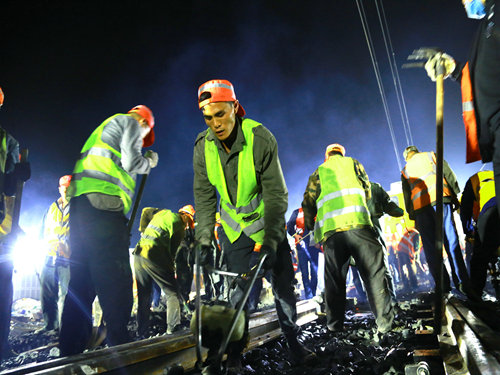 當天17時30分,隨著施工負責人的一聲令下,400余名“鐵裁縫”們如離弦之箭迅速沖向股道,搭接回流線、發(fā)動馬達、拔除舊砟、安裝切軌機、拆除舊鋼軌及枕木......一時間,指揮聲、吶喊聲、機器轟鳴聲頓時響徹整個施工現場。