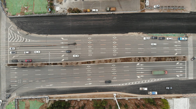 南四環(huán)路站交通導(dǎo)改道路按4+3車道設(shè)計(jì),總長389m,寬17m;前進(jìn)大街南站交通導(dǎo)改道路按5+2車道設(shè)計(jì),總長433m,寬7.5~16.5m,從路槽開挖、山皮石、級配碎石填筑碾壓到混凝土澆筑再到瀝青混凝土路面攤鋪,施工完成僅用了35天時間,提前5天完成節(jié)點(diǎn)工期目標(biāo)。