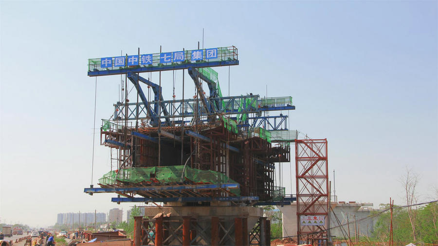 倒水河特大橋全長7825.75米,共218個墩,橋梁共有4處采取連續(xù)梁施工,分別跨越倒水河西堤、倒水河主航道、陽大公路以及天翔路。