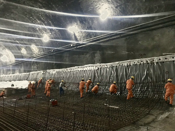 工人在橫番6號盾構井綁扎導洞鋼筋