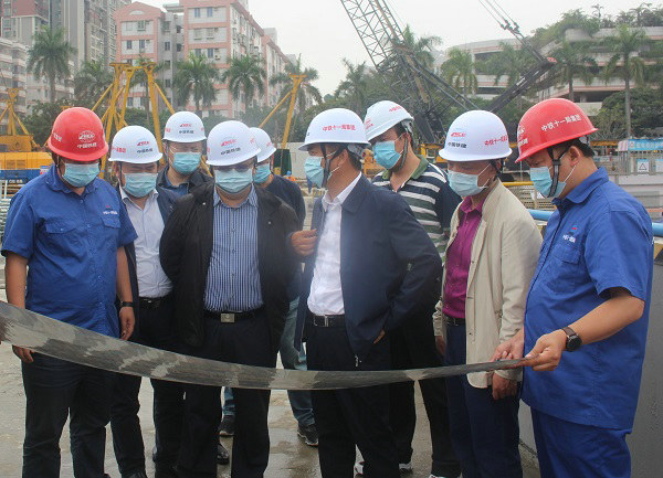 中鐵十一局總經理陳志明(右3)在番禺廣場站調研時對項目提出保開通有關要求