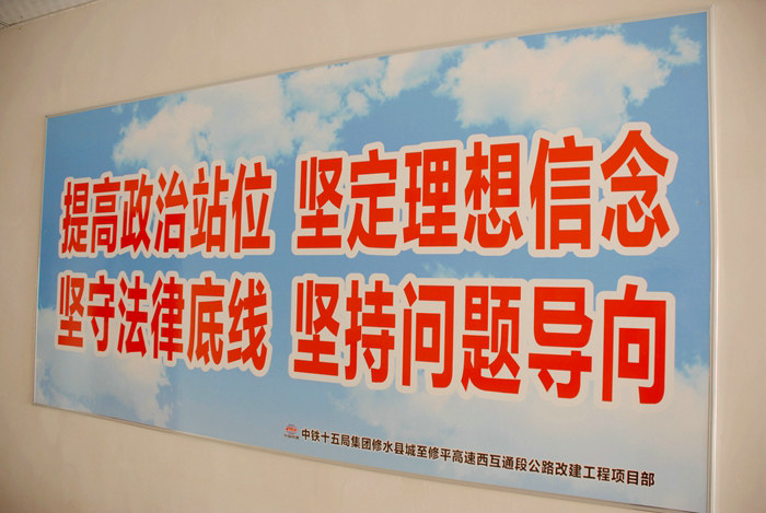 接著,孔府局長(zhǎng)說:我去年6月10日來項(xiàng)目部,感覺你們的黨建工作做得很不錯(cuò)。我去過多家施工單位,還沒發(fā)現(xiàn)像你們做得這么好,工地上處處是調(diào)動(dòng)員工積極性、黨建融入施工生產(chǎn)、促進(jìn)實(shí)現(xiàn)安全、質(zhì)量、進(jìn)度目標(biāo)的宣傳標(biāo)語、標(biāo)牌。項(xiàng)目部辦公樓走廊兩側(cè)墻上掛滿廉潔警示的名人名言、勵(lì)志的領(lǐng)袖語錄、“不忘初心、牢記使命”主題教育、提升黨員干部政治素養(yǎng)、風(fēng)光圖片等,琳瑯滿目,滿滿的正能量,會(huì)議室也有黨建內(nèi)容的宣傳牌,項(xiàng)目部有這樣的黨建文化氛圍,實(shí)在難得。