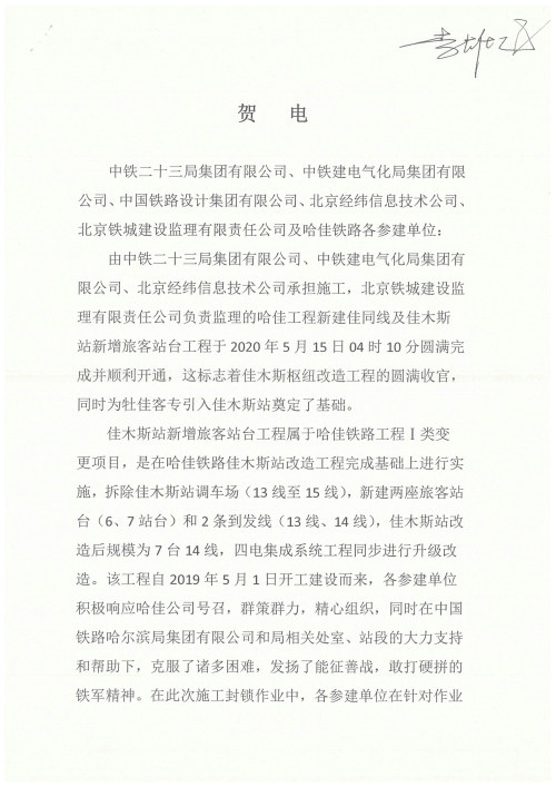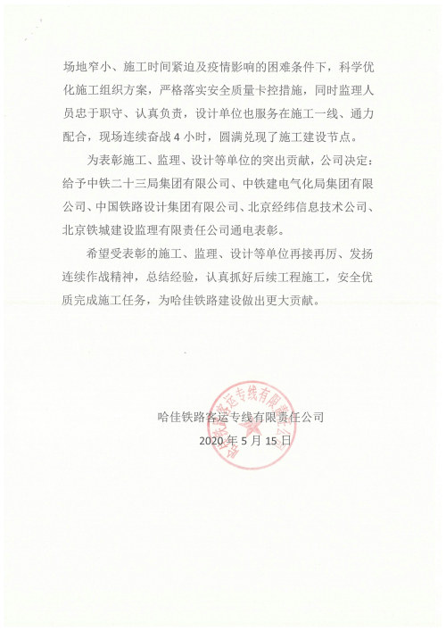5月15日,中鐵二十三局集團(tuán)哈佳項(xiàng)目部喜獲哈佳鐵路客運(yùn)專(zhuān)線有限責(zé)任公司所發(fā)賀電,通電表彰哈佳項(xiàng)目部承建的哈佳工程新建佳同線及佳木斯站新增旅客站臺(tái)工程順利開(kāi)通。