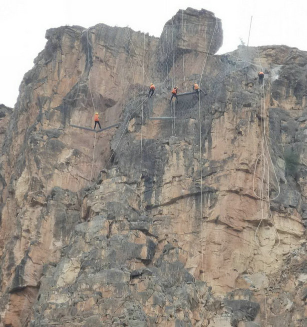 施工人員攀巖布設(shè)防護(hù)網(wǎng)清除危石
