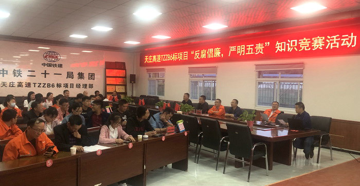 本網(wǎng)甘肅天水5月28日訊(通訊員 曹倩 彭英)5月27日晚8點,中鐵二十一局天莊高速TZZB6標項目組織召開了“反腐倡廉、嚴明五責”知識競賽活動,活動由項目副經(jīng)理錢海主持,項目部全體人員、各工區(qū)負責人,各參賽選手等參會。