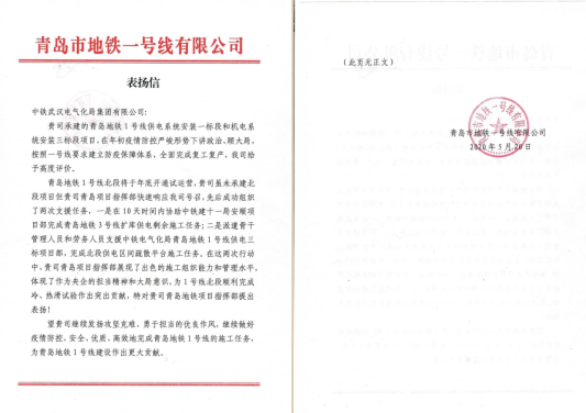 表?yè)P(yáng)信提出:“貴司雖未承建1號(hào)線北段項(xiàng)目,但貴司青島指揮部積極響應(yīng)我方號(hào)召,先后成功組織兩次支援任務(wù),為青島地鐵1號(hào)線北段順利完成冷、熱滑試驗(yàn)作出突出貢獻(xiàn)”。指揮部負(fù)責(zé)人表示,兩次支援行動(dòng),展示了武漢電氣化局的企業(yè)品牌,旨在為業(yè)主排憂解難,同時(shí)也為青島地鐵1號(hào)線南段的后續(xù)施工打下了堅(jiān)實(shí)基礎(chǔ)。下一步,青島項(xiàng)目全體參建員工將會(huì)再接再厲,繼續(xù)發(fā)揚(yáng)攻堅(jiān)克難、勇于擔(dān)當(dāng)?shù)膬?yōu)良作風(fēng),安全、優(yōu)質(zhì)、高效地完成青島地鐵1號(hào)線的施工任務(wù),為青島地鐵的建設(shè)作出更大的貢獻(xiàn)。