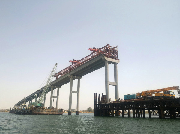 5月31日,以往風(fēng)平浪靜的塞內(nèi)加爾賽魯姆河上,一艘龐大的5000噸海上駁船在動(dòng)力船的牽引下正緩緩靠近河中央的棧橋。此刻,所有人的目光匯聚在方久尼大橋的棧橋上。隨著操作手的一聲令下,甲板上180噸履帶吊堅(jiān)實(shí)有力的提起震動(dòng)錘,精準(zhǔn)無誤地固定在橋樁上,伴隨著機(jī)械的轟鳴聲,最后一根橋樁被順利拔出,標(biāo)志著由中鐵七局武漢公司負(fù)責(zé)施工的塞內(nèi)加爾方久尼第一階段330m海上棧橋拆除工作正式完成。