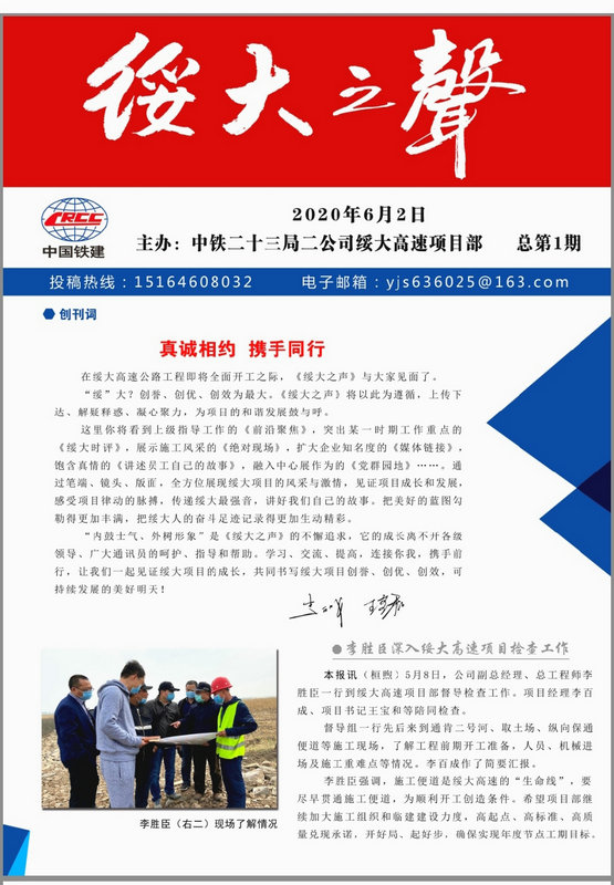 6月2日,在綏大高速公路工程即將全面開工之際,中鐵二十三局集團(tuán)二公司綏大項目部主辦的《綏大之聲》電子小報創(chuàng)刊號,與您相聚在“屏”幕。