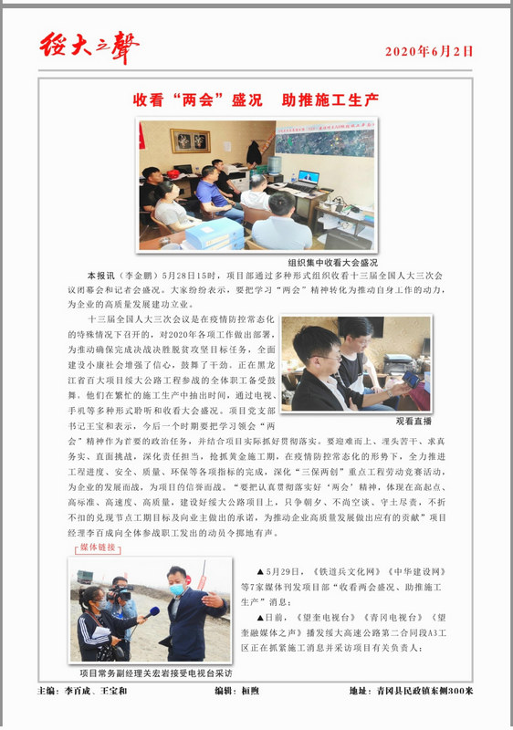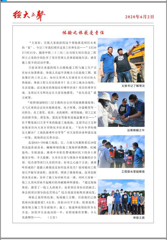 《綏大之聲》聲聲入耳。為了把小報辦出特色,展示項目文化,特邀請公司工會主席朱建國題寫了報頭,項目經(jīng)理李百成、支部書記王寶和撰寫創(chuàng)刊寄語把關(guān)定向,大家共同策劃積極建言獻(xiàn)策,勾畫出凝聚共同心血和智慧的辦報藍(lán)圖。上級指導(dǎo)工作的《前沿聚焦》,突出某一時期工作重點的《綏大時評》,展示施工風(fēng)采的《絕對現(xiàn)場》,擴(kuò)大企業(yè)知名度的《媒體鏈接》,飽含真情的《講述員工自己的故事》,融入中心展作為的《黨群園地》,文學(xué)愛好者的《芳草》副刊……。通過筆端、鏡頭、版面,搭建了上級、業(yè)主、社會溝通了解企業(yè)的平臺,全方位展現(xiàn)綏大項目的風(fēng)采與激情,見證項目成長與發(fā)展,傳遞綏大最強(qiáng)音,把綏大人的奮斗足跡記錄得更加生動精彩。