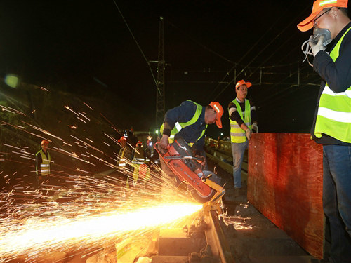 建設者進行鋼軌切割作業(yè)