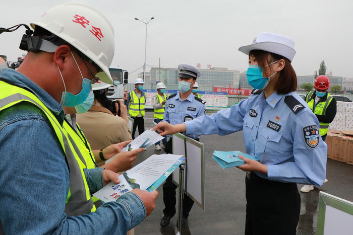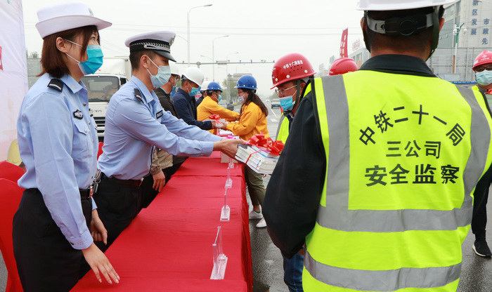 出席活動的領(lǐng)導及嘉賓為參建人員發(fā)放了各類安全知識書籍;新區(qū)公安局交通警察大隊警官任文武、劉迪為全體參建人員發(fā)放了道路交通安全宣傳彩頁,重點普及了道路交通安全法律法規(guī)相關(guān)方針、政策等方面的知識;中川園區(qū)應急管理局局長王立玉為全體參建人員發(fā)放了各類應急救援及逃生宣傳海報及安全生產(chǎn)法宣傳手冊;參與活動的領(lǐng)導及嘉賓為施工現(xiàn)場一線管理人員及勞務(wù)人員發(fā)放了活動紀念品。項目部分安全管理人員、勞務(wù)人員就有關(guān)道路安全法律法規(guī)等方面存在的問題向兩位警官進行了咨詢。