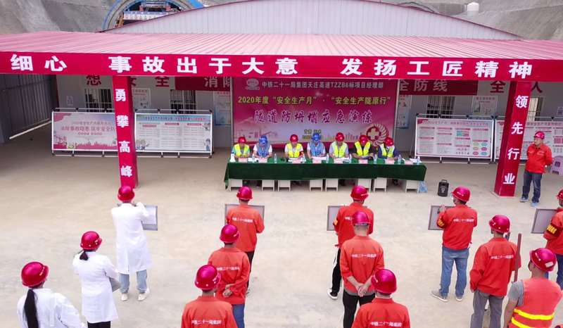 6月21日,中鐵二十一局四公司天莊項(xiàng)目部在西城山隧道出口組織開(kāi)展以“消除事故隱患、筑牢安全防線”為主題的隧道防坍塌應(yīng)急救援演練。