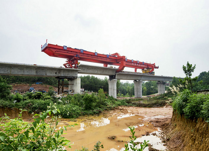 (圖片為黃黃高鐵蘄河特大橋16-17號(hào)橋墩166孔橋架設(shè)落梁畫(huà)面)
