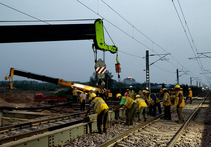 早晨5點(diǎn)30分,封鎖點(diǎn)命令下達(dá)后,施工人員有條不紊、熱火朝天進(jìn)行作業(yè),拆除縱梁連接板、拆除連接件、用木支撐支牢固、道砟回填等工序緊密銜接,充分利用點(diǎn)內(nèi)每分每秒。項(xiàng)目部自6月23日框架橋頂進(jìn)到位后開始橫梁拆除作業(yè),利用6月28日和6月30日兩次170分鐘封鎖要點(diǎn),分別在專用線下穿京廣線處和洹水灣下穿京廣線處拆除了14片拼接長(zhǎng)度為48m和20片拼接長(zhǎng)度為72m的縱梁,均在點(diǎn)內(nèi)提前完成作業(yè),并于6月30日上午完成全部架空線路拆除作業(yè),拆除過程安全、文明、高效,得到了鐵路局相關(guān)配合單位和業(yè)主的充分肯定。