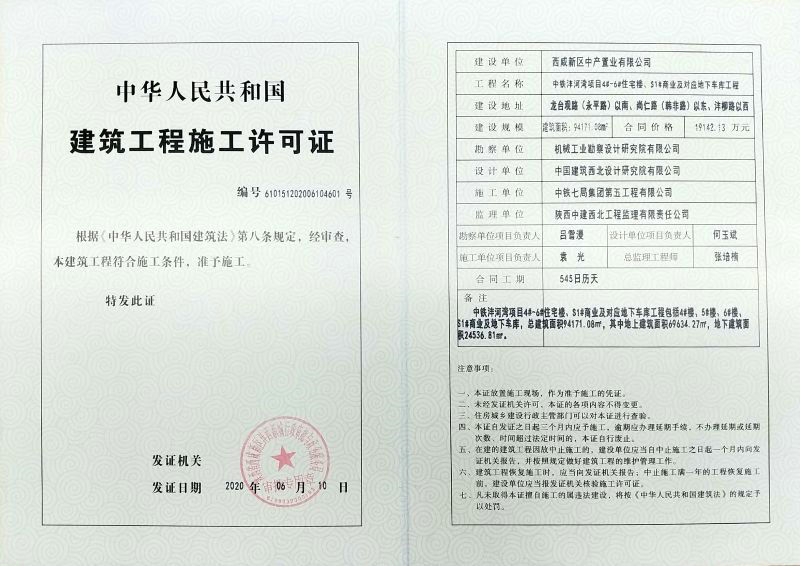 日前,經(jīng)過中鐵七局中產(chǎn)置業(yè)公司中鐵·灃河灣項(xiàng)目全體員工數(shù)月來積極主動(dòng)、攻堅(jiān)克難的努力,項(xiàng)目《建設(shè)工程施工許可證》終于在6月10日成功拿下。