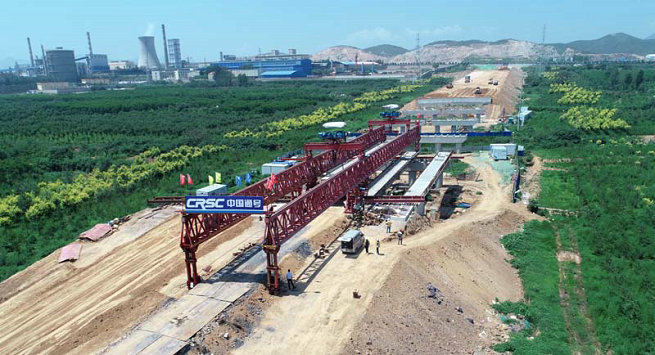 自2019年開工建設(shè)以來,項(xiàng)目部秉承安全生產(chǎn),人人有責(zé)的理念。面對大氣環(huán)保管控、業(yè)主資金短缺等困難,項(xiàng)目部發(fā)揚(yáng)“不等不靠,迎難而上”的精神,采取得力措施。經(jīng)歷了樁基、墩柱、系梁、蓋梁等的施工建設(shè),進(jìn)入上部結(jié)構(gòu)架梁環(huán)節(jié)。雙導(dǎo)梁架橋機(jī)7月8日進(jìn)場,在經(jīng)歷一個(gè)星期的拼裝、走行軌的鋪設(shè),7月16日通過公司特種設(shè)備的驗(yàn)收。7月18日第一片箱梁安全架設(shè)到位,工程正式進(jìn)入架梁階段。為8月初將進(jìn)入營業(yè)線架梁施工奠定基礎(chǔ)。