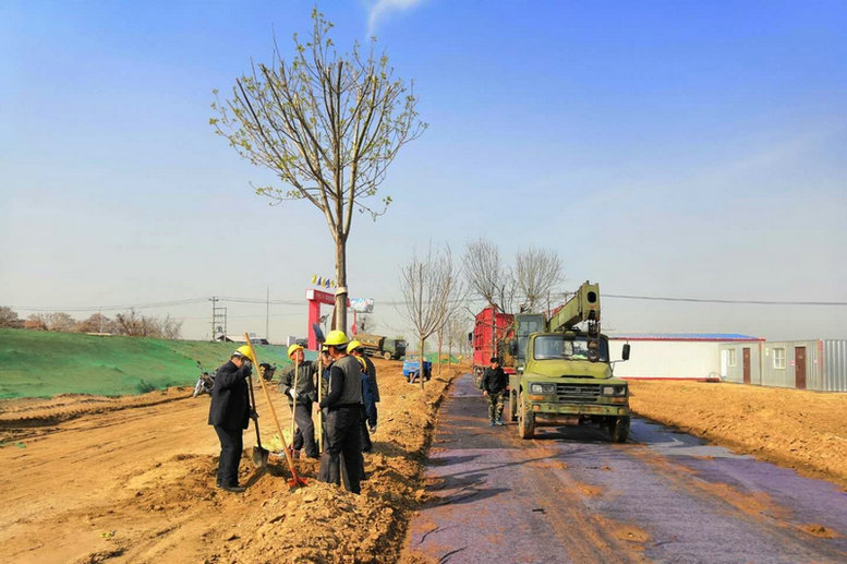 “兵來將擋,水來土掩”。項(xiàng)目部組織人員迅速用土工布覆蓋裸露沙土46.33萬平方米,調(diào)動(dòng)20臺(tái)灑水車和5臺(tái)霧炮機(jī)灑水降塵,沙大風(fēng)急的問題很快得到遏制。不謀全局者不足以謀一時(shí),項(xiàng)目部決定搶先一步進(jìn)行綠化施工,隨車吊裝運(yùn)樹苗,挖掘機(jī)挖坑填土,灑水車澆水除塵,工人們加班加點(diǎn)載種景觀樹木,楊樹等喬木灌木及丹參、地黃、月季等地被植物很快就林立在河道兩岸的景區(qū)道路兩側(cè),為景區(qū)綠化和長久防風(fēng)固沙打下了基礎(chǔ)。