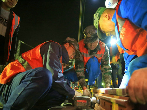 據(jù)中鐵一局鋪架項目負(fù)責(zé)人介紹,本次施工需舉全軍之力在300分鐘內(nèi)同時完成該站重(重慶)懷(懷化)兩端既有4組道岔拆除,插入軌節(jié)230m,拆安安全防護網(wǎng)800m,并完成該站材料工機具倒運、標(biāo)識標(biāo)志涂刷等系列施工任務(wù)。
