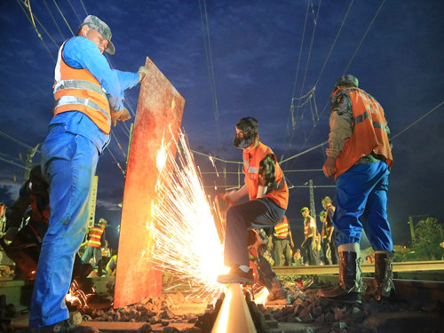 當(dāng)天17時34分,隨著開工命令的下達,600余名工人在狹小的空間內(nèi)有序進行開斷鋼軌、拆除既有道岔施工,鏟車挖機在現(xiàn)場人員的指揮下爭分奪秒地進行破底清砟任務(wù),隨后插入軌節(jié)連通線路、K車補砟、大機搗固養(yǎng)護、搭設(shè)安全防護隔離網(wǎng)等站改工序均按照既定計劃穩(wěn)步推進。