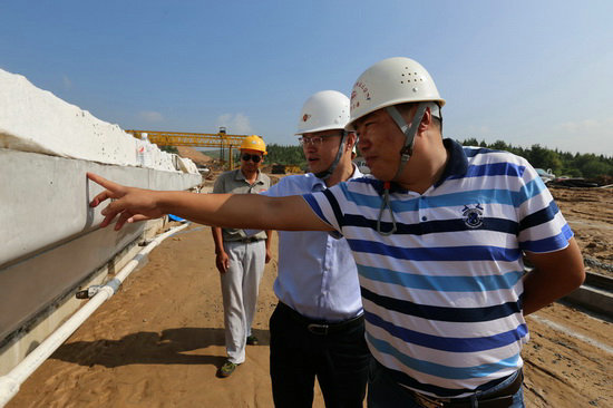 項(xiàng)目經(jīng)理王軍(前)與副總經(jīng)理郝敬豪(中)察看T梁預(yù)制。