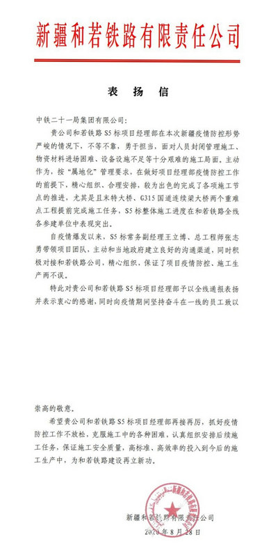 8月28日,中鐵二十一局一公司收到和若鐵路公司表揚(yáng)信,對該公司所屬和若鐵路S5標(biāo)項(xiàng)目部自年初疫情爆發(fā)以來能夠克服疫情影響確保各項(xiàng)工程節(jié)點(diǎn)實(shí)現(xiàn)給予高度贊揚(yáng)。