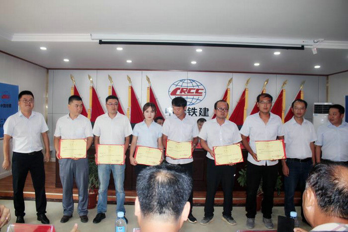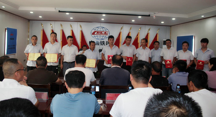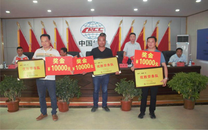 圖為勞務(wù)隊(duì)領(lǐng)獎(jiǎng) 會(huì)上,首先由項(xiàng)目部常務(wù)副經(jīng)理王亞輝根據(jù)項(xiàng)目經(jīng)理辦公會(huì)精神,對前期施工中表現(xiàn)突出的部門、工區(qū)、勞務(wù)隊(duì)及個(gè)人進(jìn)行了表彰,為下一步項(xiàng)目大干樹立了榜樣,并傳達(dá)了公司“大干120天”勞動(dòng)競賽活動(dòng)會(huì)議精神;接著,項(xiàng)目書記劉富強(qiáng)宣讀“大干120天”勞動(dòng)競賽動(dòng)員令;項(xiàng)目副經(jīng)理?xiàng)罱?、?xiàng)目總工程師陳勇、項(xiàng)目安全總監(jiān)姚呂清分別對大干120天相關(guān)通知與要求文件進(jìn)行了宣讀。然后,由工區(qū)、勞務(wù)隊(duì)代表分別進(jìn)行了表態(tài)發(fā)言。