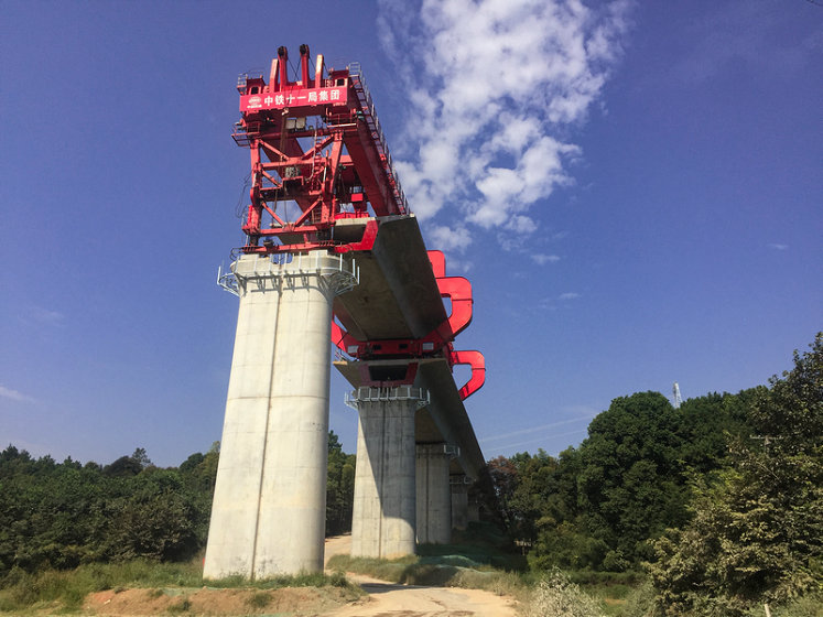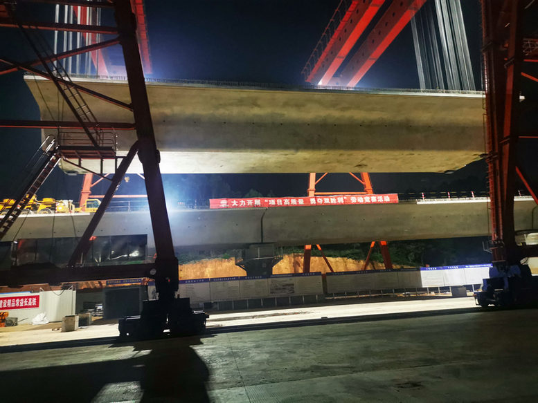 9月5日22時(shí)29分,中鐵十一局常益長鐵路項(xiàng)目三分部八曲河特大橋架梁施工現(xiàn)場,在SXJ900/32B架橋機(jī)的陣陣轟鳴聲中,一榀長32米、重達(dá)790噸的箱梁穩(wěn)穩(wěn)落在150#與151#墩上,這是該分部當(dāng)日完成的第6榀箱梁架設(shè),創(chuàng)造了標(biāo)段單日箱梁架設(shè)的最高紀(jì)錄,也是該分部自7月初開始架梁以來架設(shè)的第87榀箱梁。