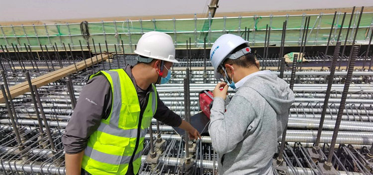 圖為“每月一星”優(yōu)秀員工王棋(左一)在施工現(xiàn)場(chǎng)檢查鋼筋綁扎質(zhì)量