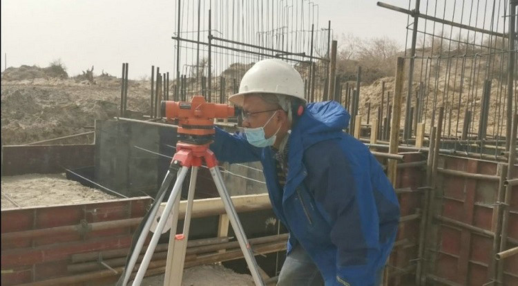 圖為“每月一星”優(yōu)秀員工溫開科在施工現(xiàn)場(chǎng)測(cè)量