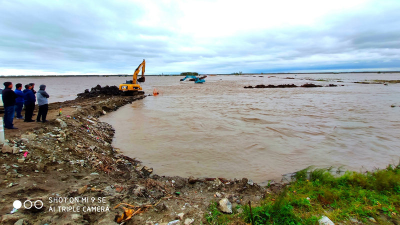 風大雨急、天昏地暗,“海神”余威肆虐。13時10分,放心不下的的項目書記王寶和趕到董家窯屯再次進行巡堤補漏。風在刮、雨在下。他挽起褲腿、趟著泥水,渾身早已是透心涼,深一腳、淺一腳艱難走在濕滑的堤壩上,穿行于兩臺挖掘機之間。“向前推進2米、再來、再來點……”順著王寶和的手勢抓斗不停的反轉(zhuǎn),再次對董家窯屯50多米長的圍堰進行加固作業(yè),壓實加高保護農(nóng)田的臨時土壩,織密抵御洪水“防護網(wǎng)”。