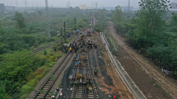 9月22日,在中鐵聯(lián)集武漢中心站內(nèi),中鐵七局武漢公司施工人員冒著大雨順利完成43號道岔軌道施工,標志著中歐班列集結中心——中鐵聯(lián)集武漢鐵路集裝箱中心站新增線束工程順利貫通,使該線路初步具備通車條件。該項目預計9月28日完成交驗,開通后中歐班列(武漢)年編發(fā)量將達500列。