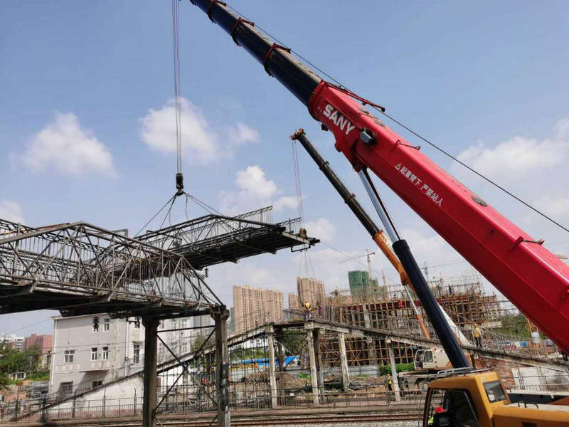 孝感花園火車站建于1902年,既有老天橋建于上個(gè)世紀(jì)70年代初,橫跨繁忙的京廣線上下行線。天橋由于使用年限久遠(yuǎn),原有鋼桁架、次梁等結(jié)構(gòu)老化,銹蝕極為嚴(yán)重,存在著較大安全隱患。本次共拆除既有天橋三跨鋼桁架及次梁,跨越花園站站內(nèi)3、4、5、6、8車道等,梁底下方均有承力索和接觸網(wǎng),梁底距離承力索最近距離僅為0.51米。該項(xiàng)要點(diǎn)施工時(shí)間緊、任務(wù)重,管線遷改復(fù)雜,涉及相關(guān)產(chǎn)權(quán)單位多,外協(xié)工作艱巨,拆除安全風(fēng)險(xiǎn)等級(jí)高。