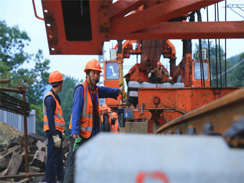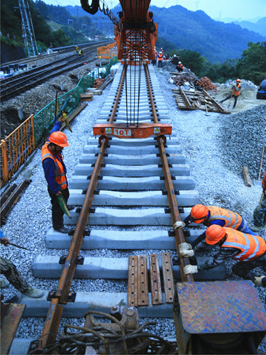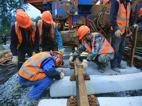 目前,為確保最后一階段的施工任務(wù)按照計劃有序推進,項目部統(tǒng)籌部署,倒排工期,第一時間安排技術(shù)人員與線下單位進行對接,測量人員及時落實線路標高復(fù)測工作,并做好路基交接記錄。同時,項目部搶抓渝東南地區(qū)大霧尚未到來的大好施工季節(jié),調(diào)撥了兩臺鋪架設(shè)備,配足充裕人員,分別從兩端齊力開展施工,并在保證安全與質(zhì)量的前提下,對日施工進度進行嚴格控制,堅持評比考核,獎罰兌現(xiàn)制度。最終,系列舉措的貫徹落實,不斷調(diào)動了廣大參建人員的工作積極性,掀起了一輪又一輪的施工大干高潮。