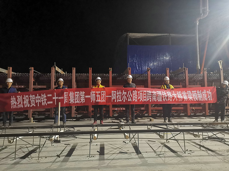 10月11日凌晨1點(diǎn),隨著最后一罐混凝土的順利澆筑,由中鐵二十一局一公司承建的第一師五團(tuán)-阿拉爾公路項(xiàng)目跨南疆鐵路大橋項(xiàng)目首片預(yù)制箱梁澆筑完成。