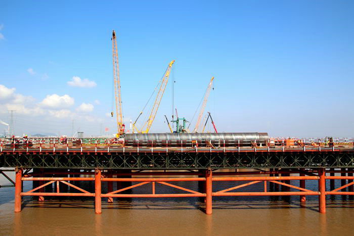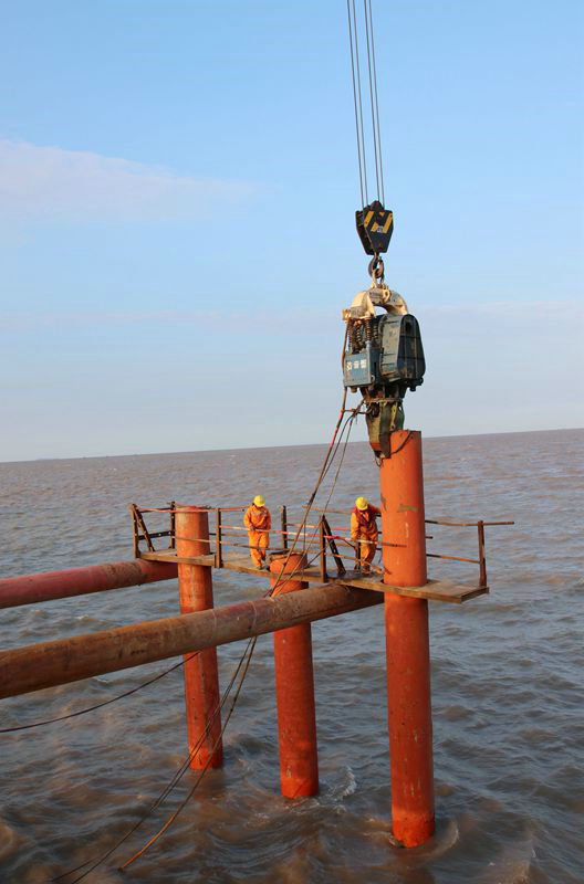 位于寧波境內(nèi)淺海區(qū)域的濱海高架橋和濱?;ネ⒔恢骶€全長6.9公里,8座匝道橋長6386.626米,橫跨既有線金塘大橋,施工地段為3---5.2米深的海域淺水區(qū),設(shè)計(jì)為6車道,主線橋34.5米寬,時(shí)速120公里,總投資22.3億元。海底下鋪排著多條自來水、天然氣、石油管道,地質(zhì)結(jié)構(gòu)復(fù)雜,樁基施工難度大。樁基、承臺、橋墩施工均在海水里,必須搭設(shè)一條15公里長的鋼棧橋,以滿足幾百臺機(jī)械設(shè)備上橋作業(yè)、運(yùn)輸、堆放數(shù)量龐大的工程物資。為了打好這一戰(zhàn),該項(xiàng)目通過公開招標(biāo)形式,選定海上施工經(jīng)驗(yàn)豐富的3家鋼棧橋施工隊(duì),并陸續(xù)于去年9月1日正式開始拉開海上架設(shè)6.5米高、8米寬鋼架橋序幕。三家棧橋施工隊(duì)在項(xiàng)目部協(xié)調(diào)組織下很給力,各負(fù)責(zé)一段,通力合作,主線橋棧橋于互通立交棧橋作業(yè)同時(shí)進(jìn)行。采用70噸的履帶吊懸掛振動(dòng)錘,由振動(dòng)錘咬住直徑0.66米的鋼管,向下震壓的辦法,將鋼管穿透海底淤泥層,直至36米深的膠泥或沙土層為止。然后將整齊排列的“梅花樁”用鋼管、角鋼、工字鋼分層焊接起來,再在上面拼裝一層抗壓力很強(qiáng)的厚鋼板。為了保證施工人員作業(yè)安全,在棧橋兩側(cè)安裝1.2米高的鋼管防護(hù)欄。每道工序如流水作業(yè)般環(huán)環(huán)相扣、銜接緊密、有條不紊。插入海底泥土中的鋼管,需3段鋼管對接,一氣呵成,不偏不倚地直達(dá)膠泥層或沙土層。