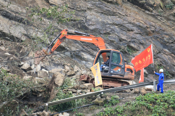 陳蕉路是高縣出入聯(lián)系的主要干道之一,道路阻斷后對(duì)來(lái)往車輛行人造成了極大的不便。災(zāi)情就是命令,搶險(xiǎn)就是責(zé)任。在向項(xiàng)目部領(lǐng)導(dǎo)做了簡(jiǎn)單匯報(bào)后,齊云立即組織10名員工以及2臺(tái)挖掘機(jī)、4輛運(yùn)輸車前往坍塌現(xiàn)場(chǎng)。在與現(xiàn)場(chǎng)當(dāng)?shù)芈氛块T簡(jiǎn)單溝通后,項(xiàng)目部搶險(xiǎn)突擊隊(duì)商討了臨時(shí)搶險(xiǎn)方案,并針對(duì)搶險(xiǎn)需要的其他物資,第一時(shí)間向項(xiàng)目部報(bào)告,迅速組織搶險(xiǎn)物資到位。搶險(xiǎn)現(xiàn)場(chǎng),突擊隊(duì)員一方面及時(shí)在坍塌處兩側(cè)拉起警戒線,設(shè)立安全防護(hù)區(qū),勸阻前來(lái)圍觀的村民;另一方面同路政部門一同組織挖掘機(jī)和運(yùn)輸車對(duì)坍塌的巨石、枯枝樹(shù)干進(jìn)行清理、運(yùn)輸。在經(jīng)過(guò)6個(gè)小時(shí)的連續(xù)作業(yè)后,坍塌現(xiàn)場(chǎng)清理完畢,道路交通恢復(fù)正常。