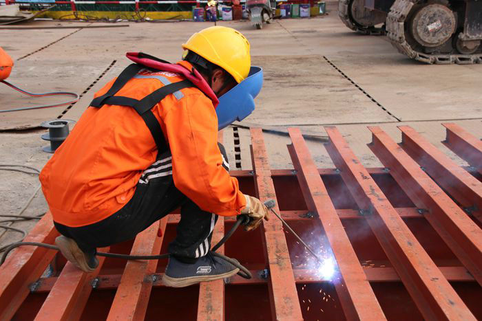 杭甬高速復(fù)線寧波段一期S3標(biāo)濱海高架橋與“一脈相承”的濱?;ネ⒔蝗L13.286公里,位于不漲潮3米,漲朝后5.2米的淺海水域,為保證樁基、承臺和墩身施工的順利進行,該項目部在海上搭建棧橋工作平臺。每個平臺標(biāo)高6.5米,長33米,寬20.5米,可承載上千噸重物的壓力。項目部采取“借雞下蛋”的策略,選用有海上架設(shè)棧橋平臺經(jīng)驗的專業(yè)隊伍進場投入施工。一批技術(shù)精湛的專業(yè)人員配合多臺可吊裝70噸以上貨物的履帶吊、重型大吊車等設(shè)備作業(yè)。超強壓力的振動錘充分發(fā)揮其威力,將一根根直徑0.66米的鋼管打入海底28米到30米以下的位置,若位置稍有偏差,在技術(shù)人員指揮下,由履帶吊來矯正,直到不差分毫。完成管樁后,在吊車的作用下,作業(yè)人員將幾種型號的圓鋼管、工字鋼、角鋼等分層有序地與插入地下的鋼管柱焊接在一起,并在上面再安裝一層鋼結(jié)構(gòu)架子,在架子上面壓一層鋼板,鋼平臺與主線棧橋以子母整體陣型,形成強大合力。每個棧橋作業(yè)平臺,可滿足多臺吊車打樁和鉆孔機鉆孔作業(yè)需要,而且成為幾百噸鋼模、各類材料的臨時中轉(zhuǎn)站,抗壓、抗臺風(fēng)能力極強。