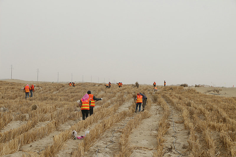 圖為項目部施工人員進行蘆葦草方格施工