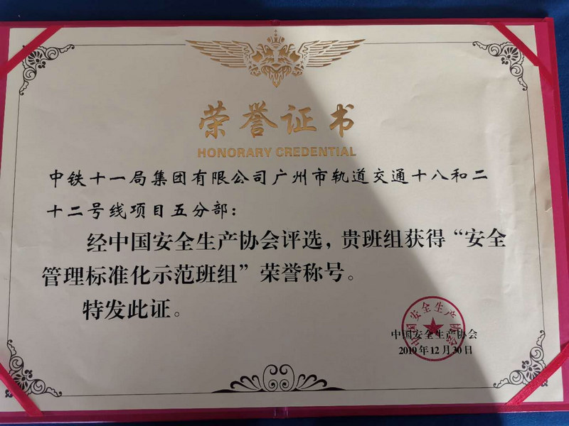 日期,在北京黃河京都會(huì)議中心中國(guó)安全生產(chǎn)協(xié)會(huì)召開(kāi)第十一屆中國(guó)班組長(zhǎng)論壇暨安全管理標(biāo)準(zhǔn)化示范班組創(chuàng)建活動(dòng)推進(jìn)會(huì)上,中鐵建華南建設(shè)公司廣州市軌道交通十八和二十二號(hào)線五分部(中鐵十一局管段)被授予2019年度“安全管理標(biāo)準(zhǔn)化示范班組”榮譽(yù)稱號(hào)。
