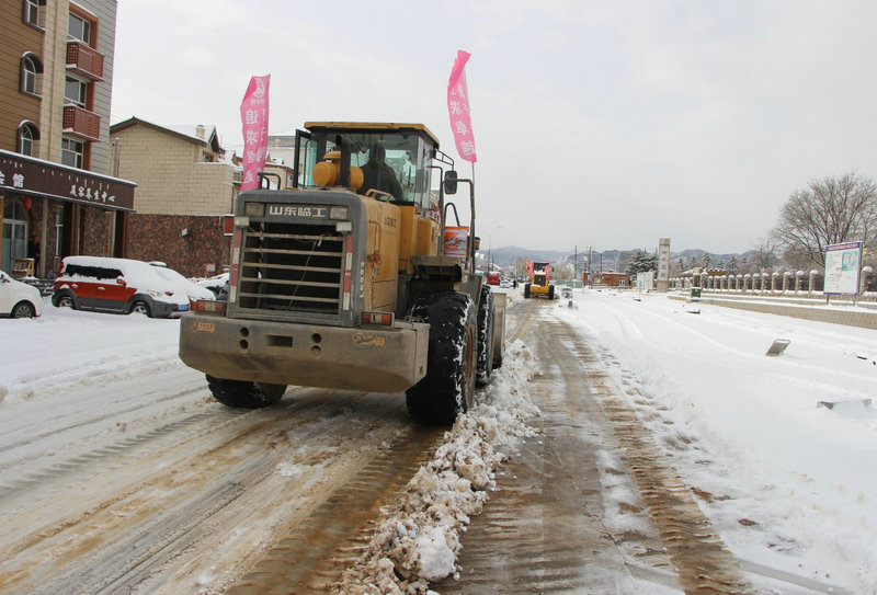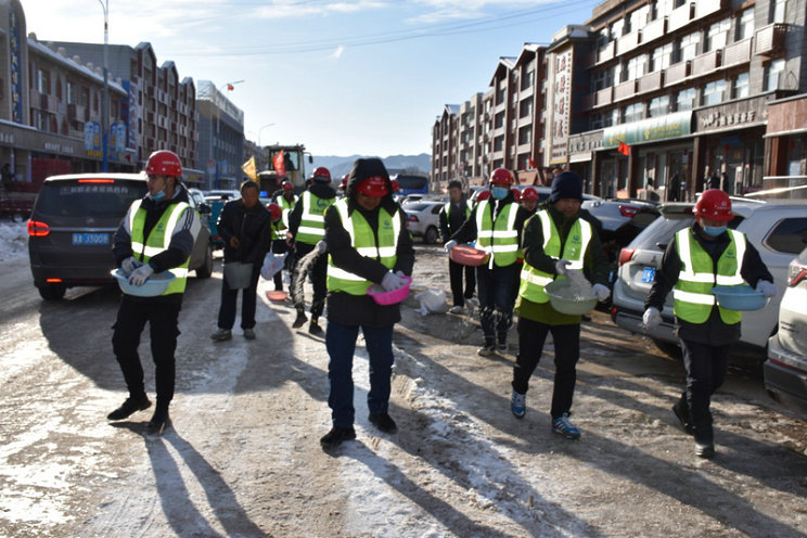 大家將項(xiàng)目購(gòu)買(mǎi)的20噸融雪劑搬運(yùn)至現(xiàn)場(chǎng),倒進(jìn)盆里,并分別撒至道路上堆滿(mǎn)積雪的地方,同時(shí)安排裝載機(jī)、平鋪機(jī)等近10臺(tái)機(jī)械和車(chē)輛清理已經(jīng)嚴(yán)重結(jié)冰的殘雪。經(jīng)過(guò)幾天的辛勤勞動(dòng),熱水大街市政段、友誼路段、熱水大街鄉(xiāng)村路段、環(huán)形路段和熱水大街的商鋪、集市區(qū)域的積雪與冰塊大部分被清理干凈,當(dāng)?shù)氐睦习傩占娂娮叱黾议T(mén),并對(duì)我們參加義務(wù)勞動(dòng)的員工們紛紛稱(chēng)謝。